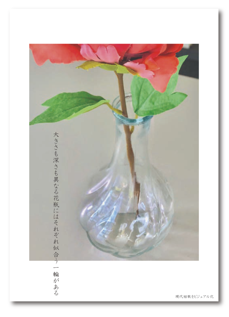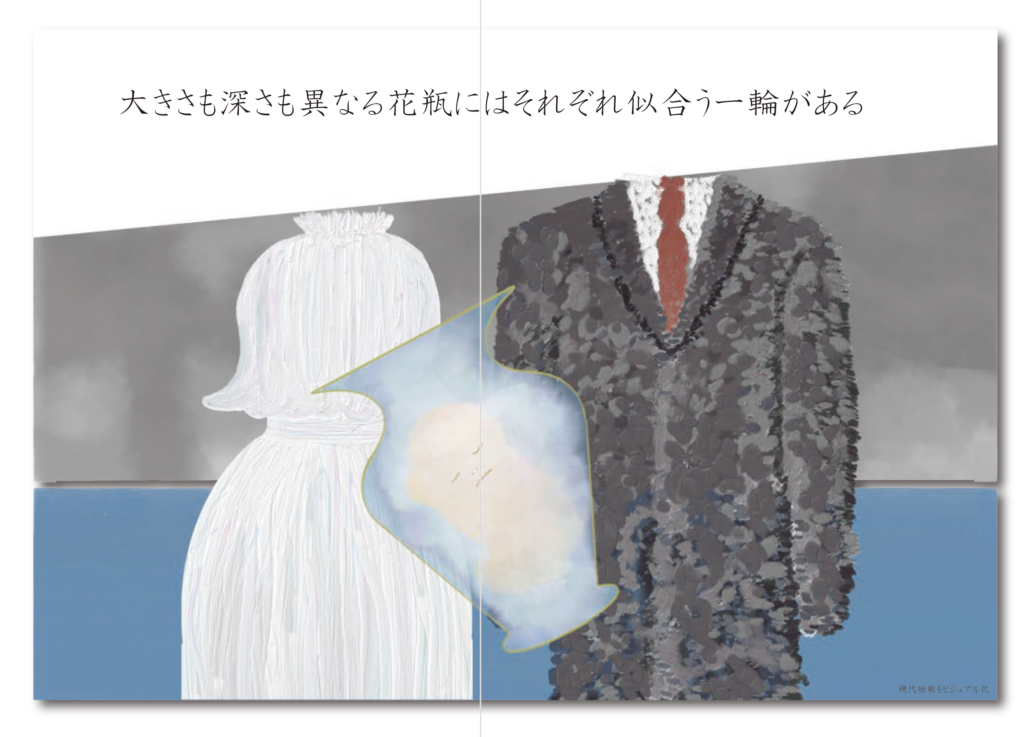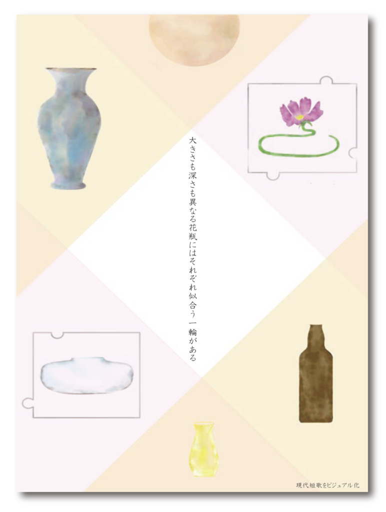現代短歌をビジュアル化 M.Akari 歌人木下龍也による「あなたのための短歌集」から短歌を一句引用し、 その短歌に対する感想を三名の方に聞きました。本作品はその感想をビジュアル化したものです。人はひとつの物事に対し千差万別の意見を抱くこと、そして本来見ることが出来ない人の頭の中を目に見える形にしたかったため、本作品を制作しました。